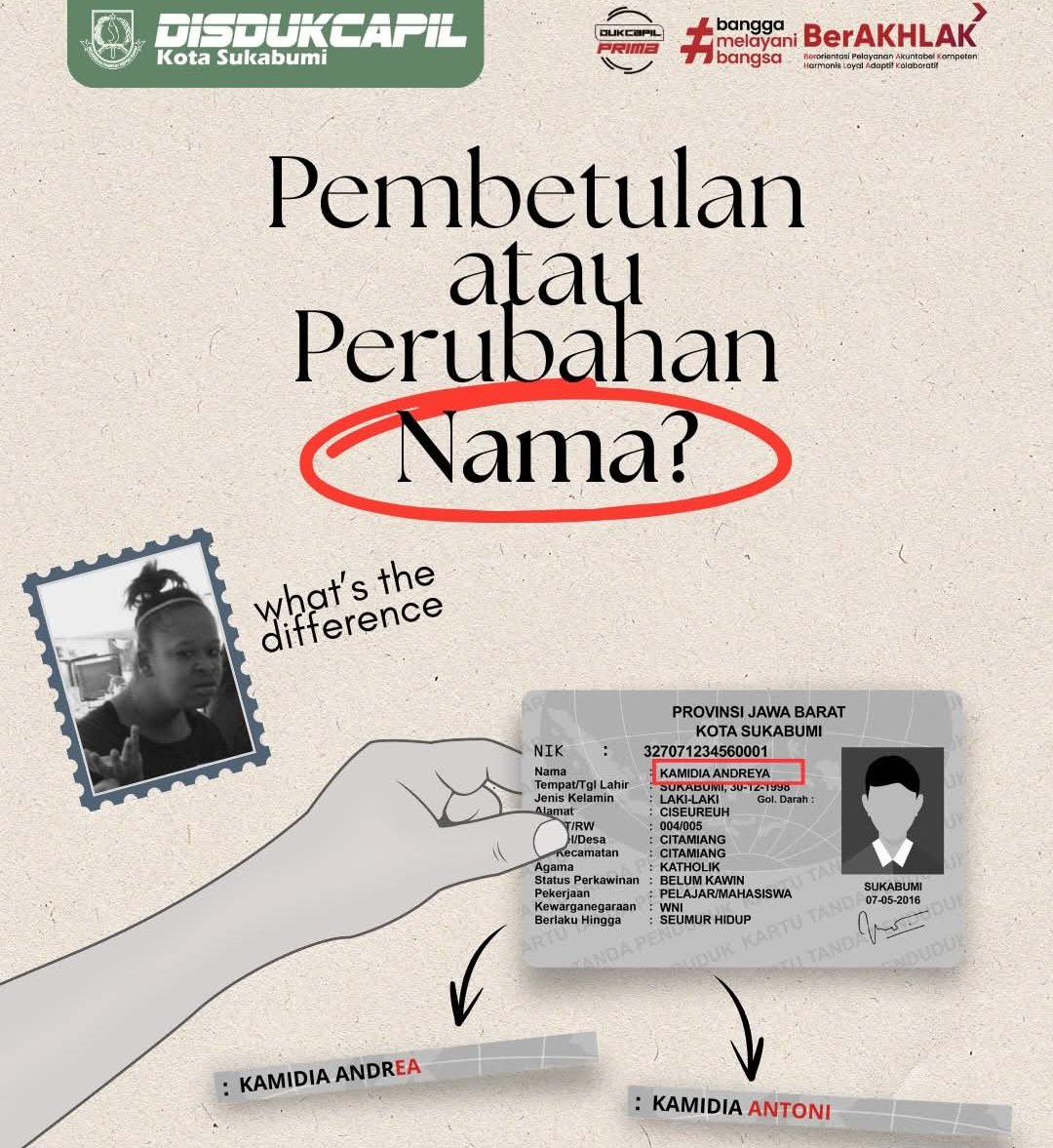 KABARINDAH.COM, Sukabumi–Dinas Kependudukan dan Pencatatan Sipil (Disdukcapil) Kota Sukabumi memberikan edukasi kepada masyarakat terkait perbedaan antara pembetulan nama dan perubahan nama pada dokumen kependudukan, khususnya KTP elektronik (KTP-el). Edukasi ini penting karena masih banyak warga yang belum memahami perbedaan kedua layanan tersebut beserta persyaratannya.