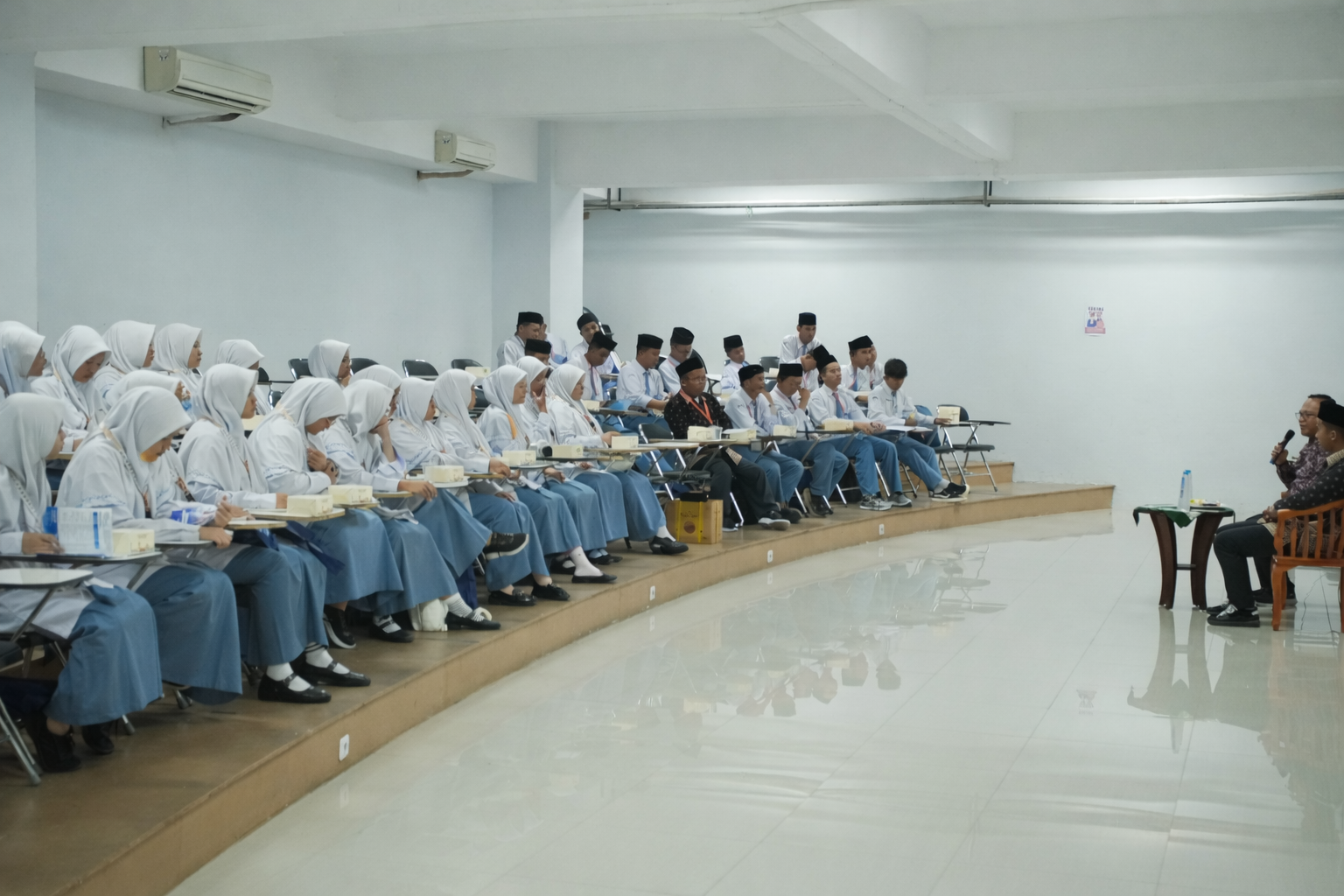 Usai mendapatkan berbagai informasi seputar kampus dan perkuliahan di ruangan, para santri pun diajak berkeliling gedung untuk melihat berbagai fasilitas. Mulai dari perpustakaan, ruang perkuliahan, auditorium, laboratorium, dan sebagainya.***