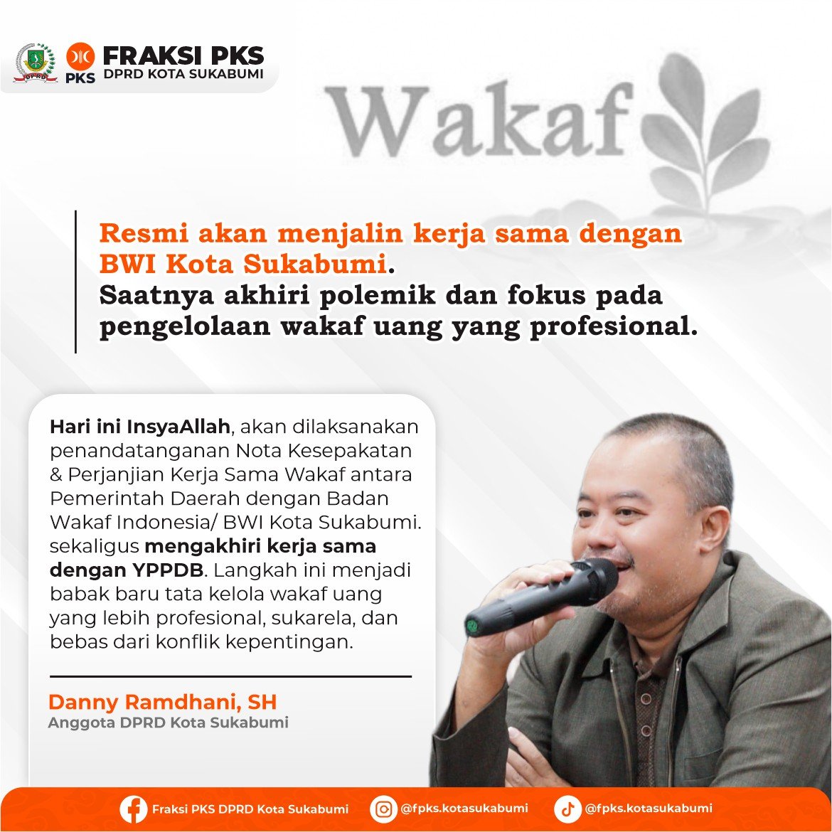 “Alhamdulillah, semoga ke depan tata kelola wakaf uang di Kota Sukabumi semakin baik. Tidak ada lagi konflik kepentingan, dilakukan secara sukarela, dan dikelola dengan lebih profesional,” ujar Danny yamg juga Ketua Fraksi PKS DPRD Kota Sukabumi.