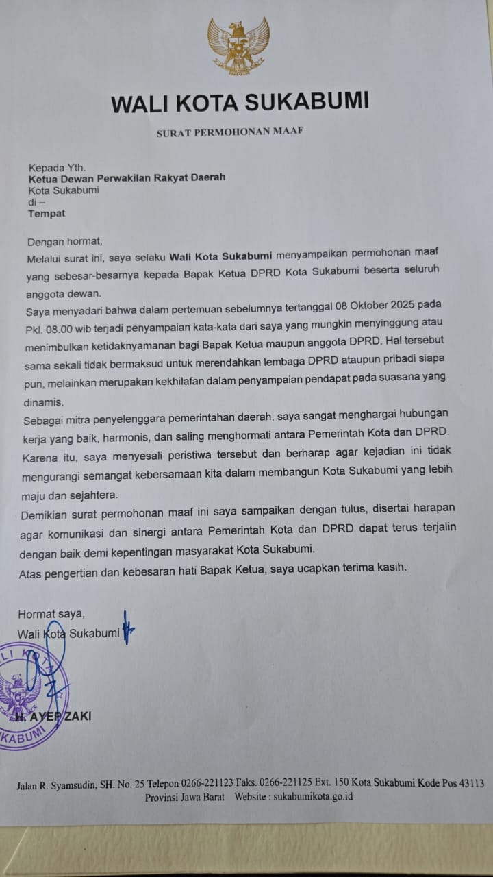 Sebelumnya, DPRD Kota Sukabumi secara kelembagaan resmi meminta Wali Kota Sukabumi, Ayep Zaki, untuk menyampaikan klarifikasi dan permohonan maaf terbuka atas pernyataannya yang dinilai tidak pantas terhadap lembaga DPRD. Pernyataan sikap itu disampaikan langsung oleh Ketua DPRD Kota Sukabumi, Wawan Juanda, didampingi Wakil Ketua DPRD Rojab Asyari dan anggota Komisi I, Opik, dalam konferensi pers di Gedung DPRD, Selasa (14/10/2025).